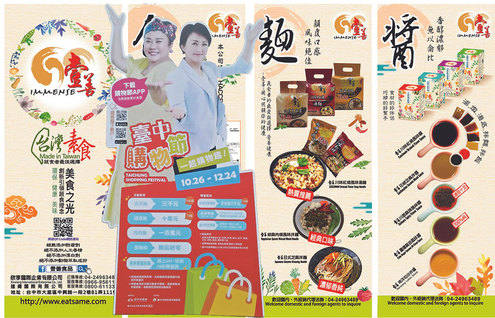 此外,有「台灣素食之光」讚譽的欣享公司陳靖宜董事長,首創全國「加盟不用錢!」, 邀請全國有志有愿推廣新蔬食文化的夥伴們,共創健康永續蔬食產業。壹善食品「欣享國際企業有限公司」總經理陳冠鴻表示,目前與統一集團配合,將有五樣新品問世,屆時將有更多素食者能更方便地吃到素食美食,大飽口福!另外官網目前也有與萊爾富超商配合「免運」活動,粉絲們可多加把握這次難得的機會,趕緊將想吃的口味加入購物車!「壹善食品」榮獲台中市政府指定為「台中購物節」的「合作店家」,消費金額再享三倍累計優惠,大大提高中獎的機會;即日起至2022年12月31日止,為支持台中市政府推出一連串振興經濟活動與補貼計畫,凡是在部落格或是臉書發表千字以上,協助臺中巿政府打造臺中成為更有水準的觀光旅遊及消費購物的城市,協助台灣中小企業創造新的轉型契機,擴展臺中觀光旅遊及消費購物的即戰力,有任何具體的創新想法或是批評建議的前一百名最熱情、最有創意的台灣民眾,憑相關部落格或是FB網站分享網址連結,每人加贈網路熱銷的「川味紅燒湯麵(刀削麵)」禮盒乙組,送完為止。壹善食品 / 欣享國際企業有限公司網站https://www.eatsame.com/ ; FB 網址: https://www.facebook.com/eatsame/ ; 蝦皮商城 : https://shopee.tw/eatsame88 ; 客服專線:04-2496-3489 ; 客服時間:10:00-17:00 ; 電子信箱:service@eatsame.com ; 公司地址:台中市大里區中興路一段2巷81弄111號。